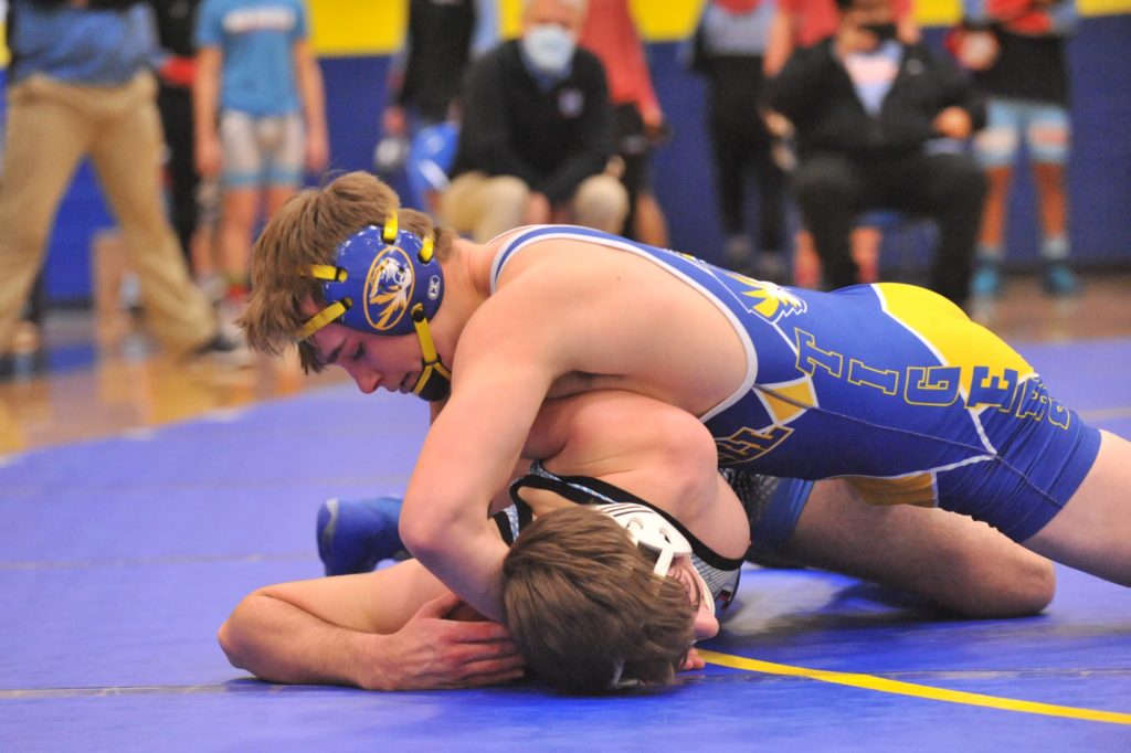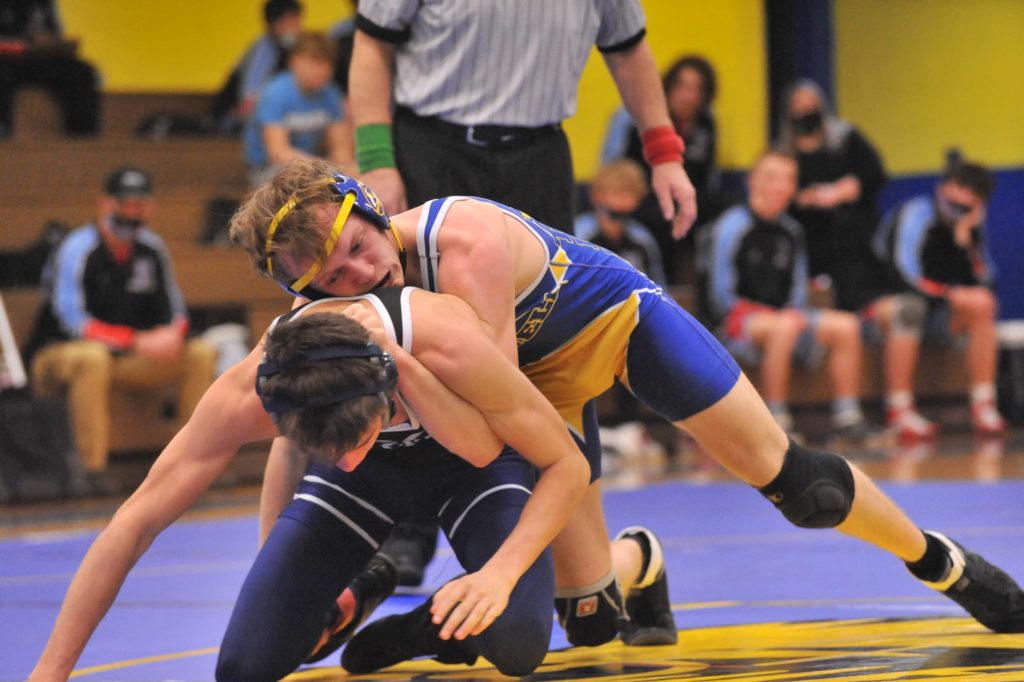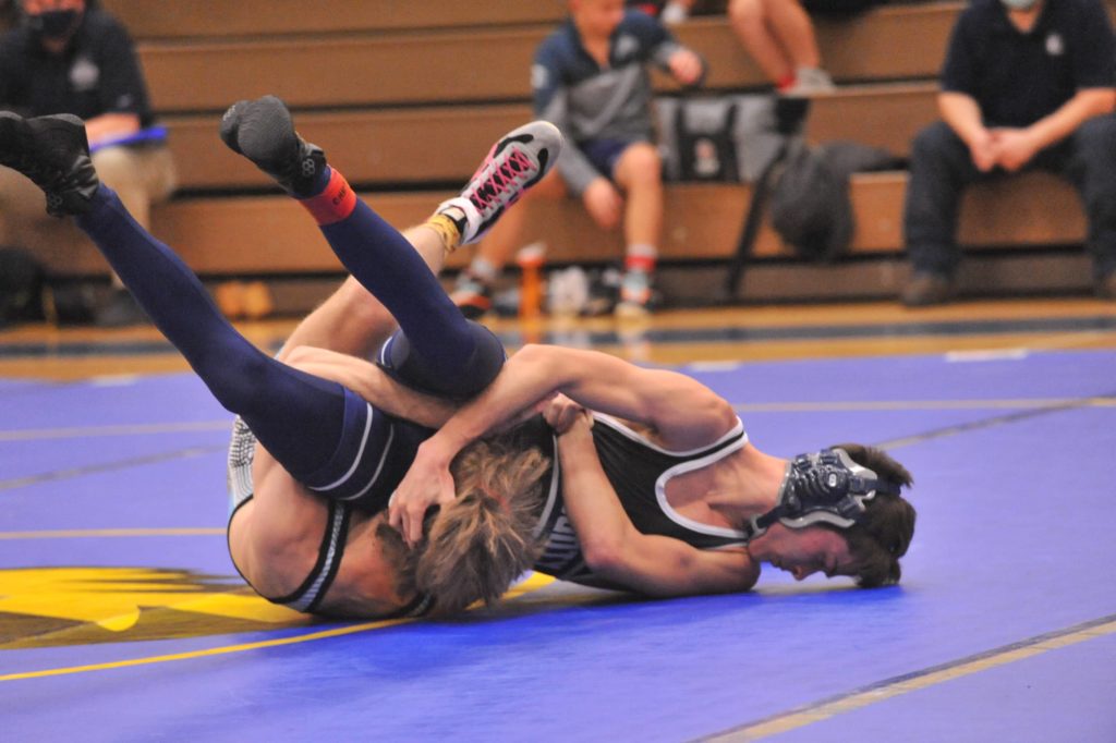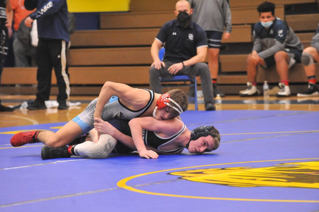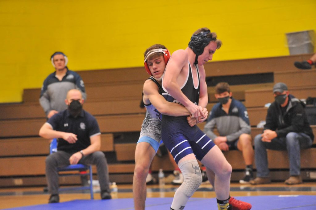 Caldwell's Riley Johnson wrestles Union County's Jake Dowdy at 145 pounds on Thursday.