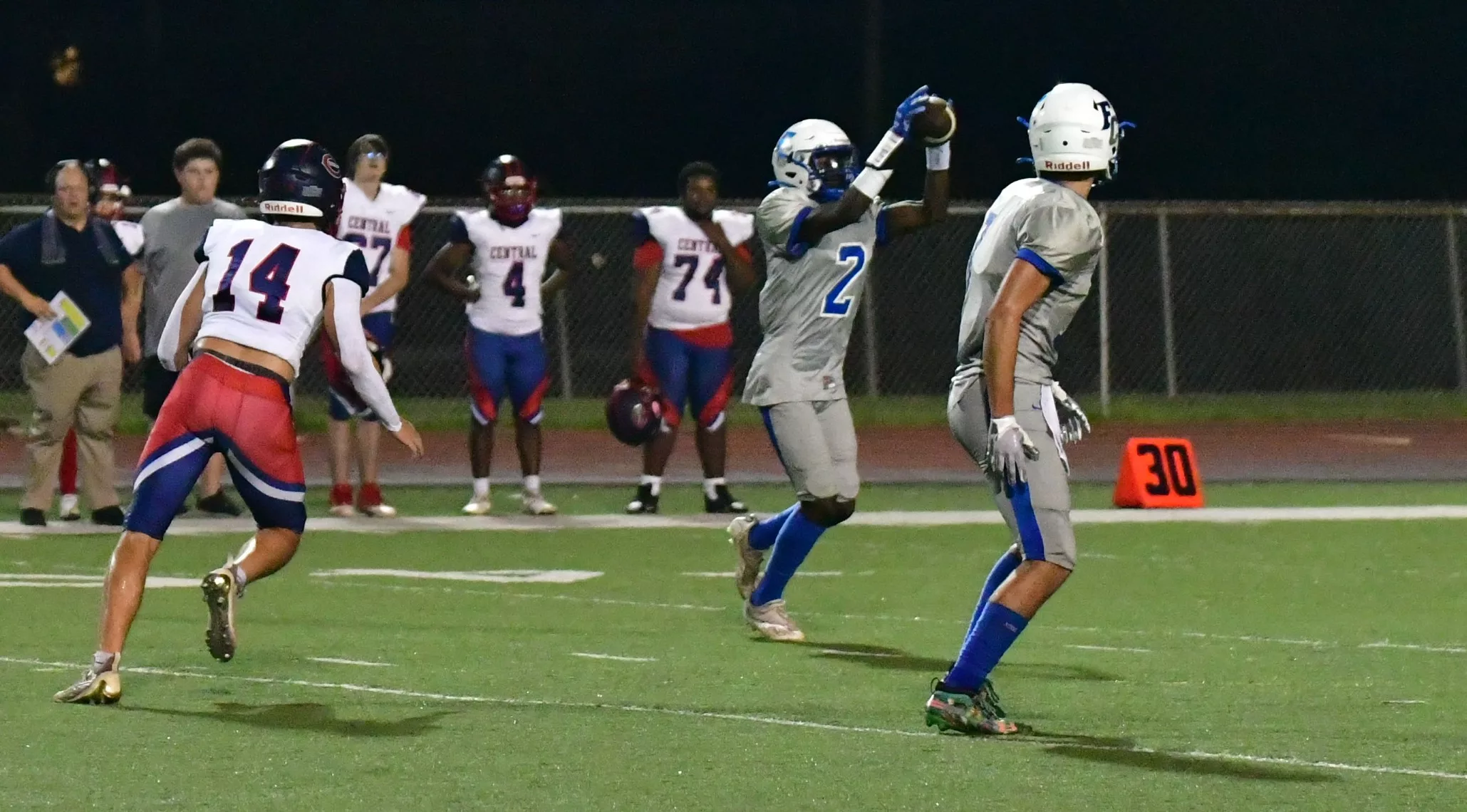 Maurice Moore caught an 18-yard scoring strike from Jonah Weisbrich for the Falcons’ first score. Weisbrich then connected with J.P. Perryman on a 67-yard pass down the right sideline to get the Falcons to within 16-14 with 8:54 left in the first half.