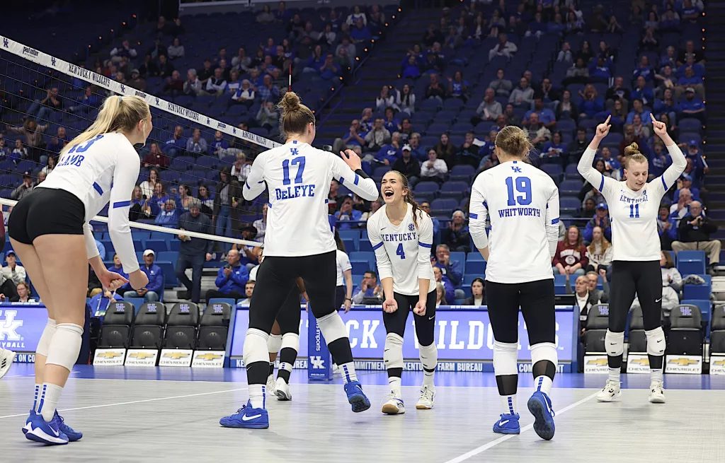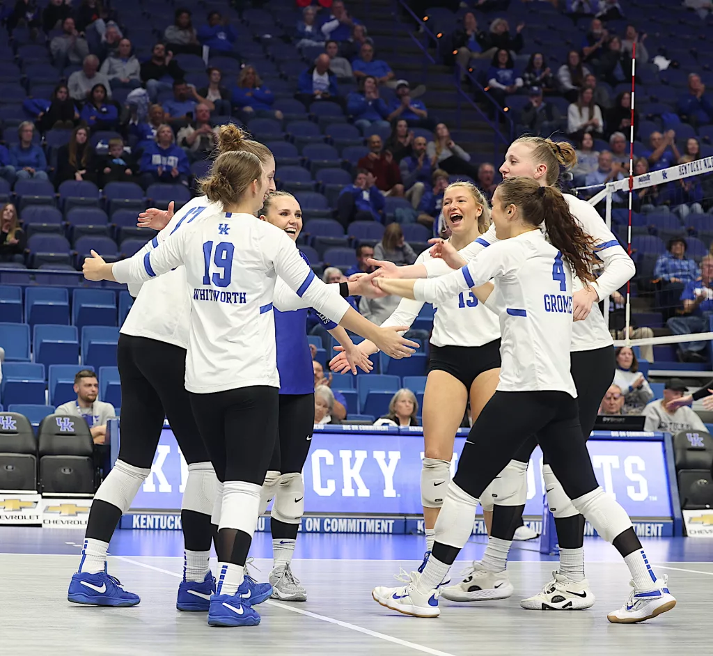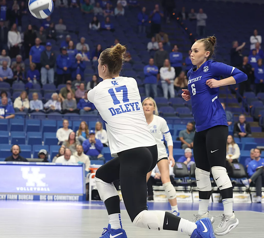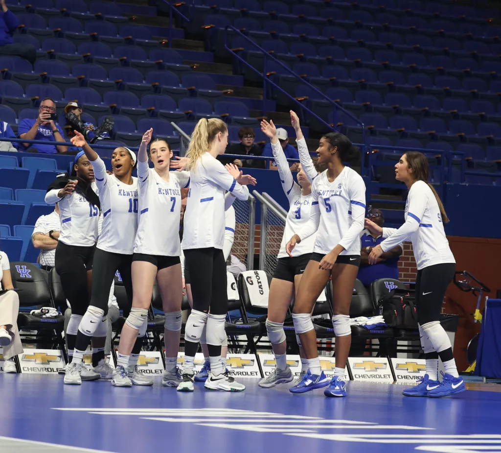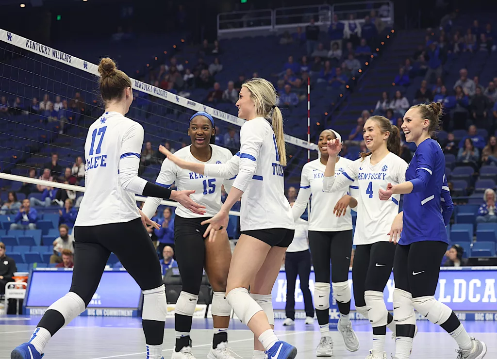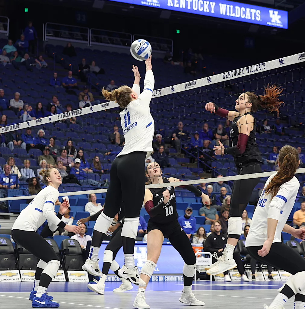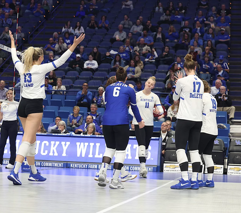 Kentucky had four players with double-digit kills —Brooklyn DeLeye 18, Elise Goetzinger 13, Erin Lamb 12 and Azhani Tealer 12. Tealer hit .688 and also added three blocks.