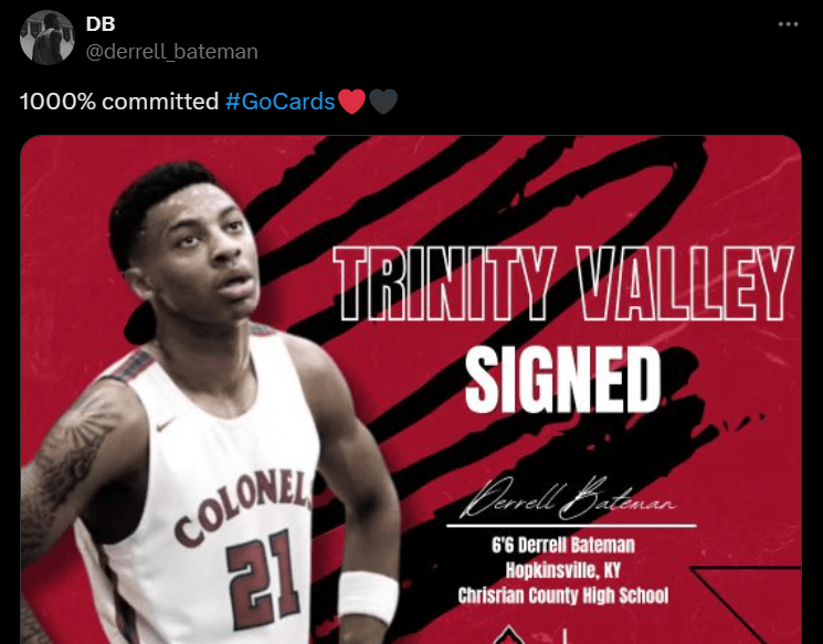 Christian County’s Derrell Bateman is heading off to ‘Deep in the Heart of Texas’ to continue his athletic and educational career. In a social media post Friday afternoon, the Christian County senior announced he had signed with Trinity Valley Community College, in Athens, Texas, just southeast of Dallas.