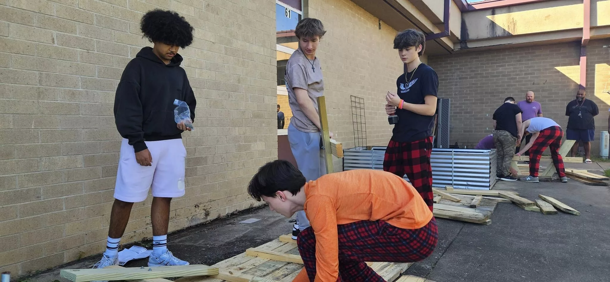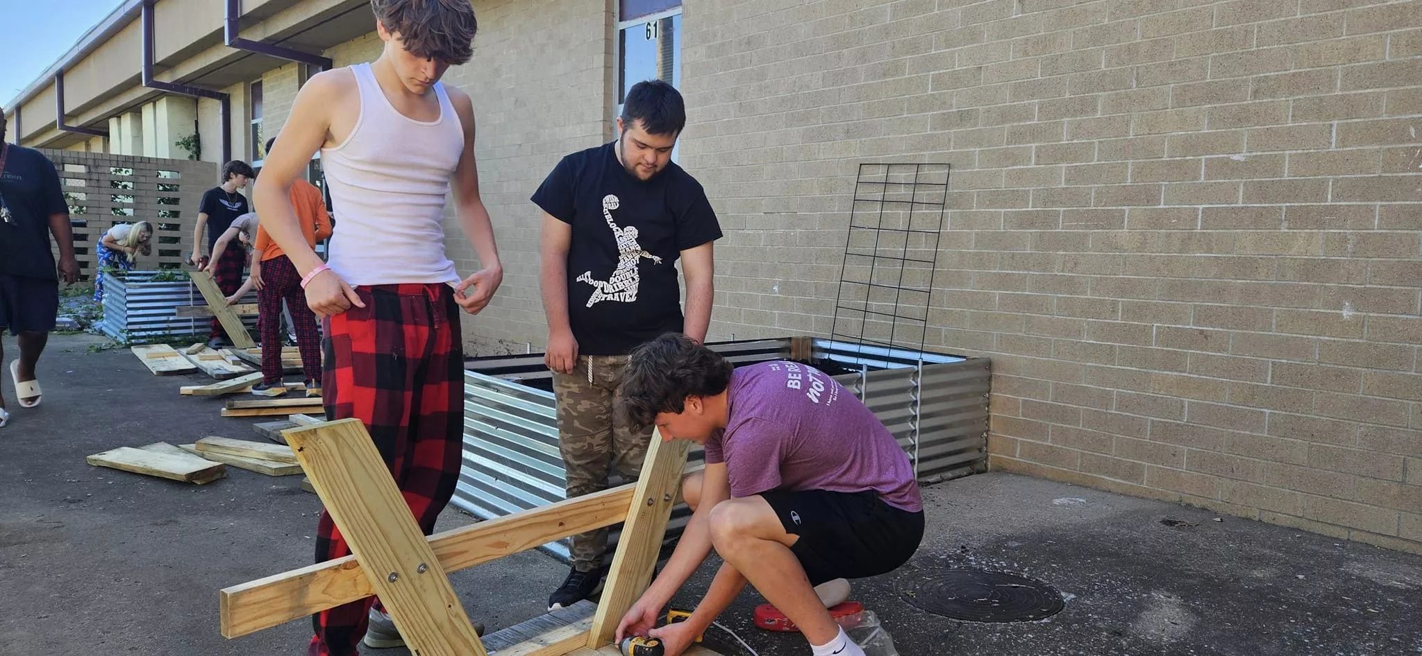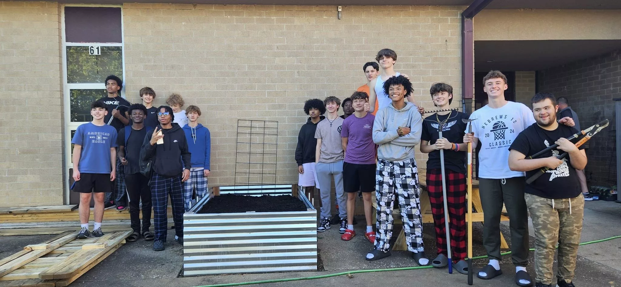 The guys spent some time working to help revitalize some of the landscaping outside the building at Madisonville-North Hopkins High School.