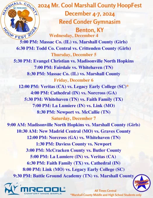 Three teams in the YourSportsEdge.Com coverage area will be taking part in the 2024 Mr. Cool Marshall County HoopFest December 4-7 at Reed Conder Gym. The schedule for the event was officially released late Thursday.