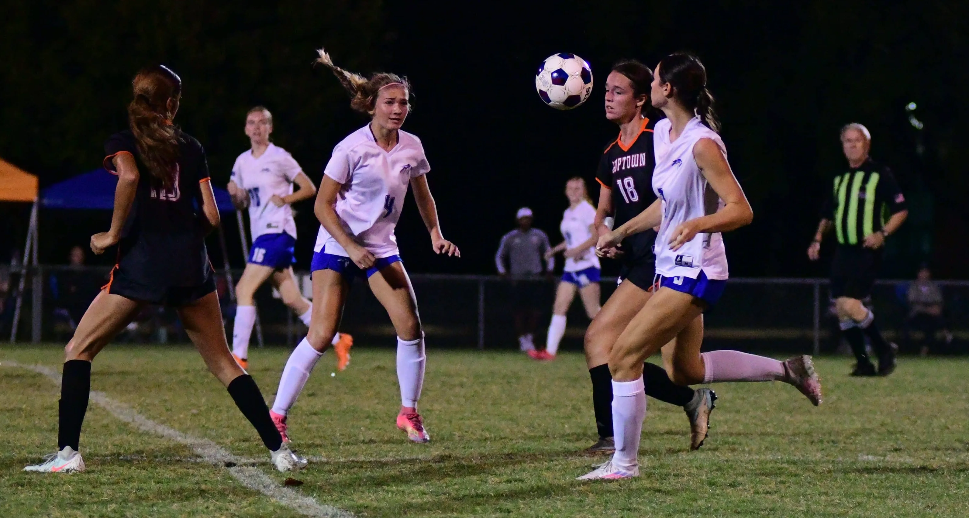 Romero mused that the layoff made his team well-rested coming into Monday’s game, and the Lady Falcons looked sharp early when Avery Katz took a bad clearing pass by Hoptown and drilled home a goal three minutes in.
