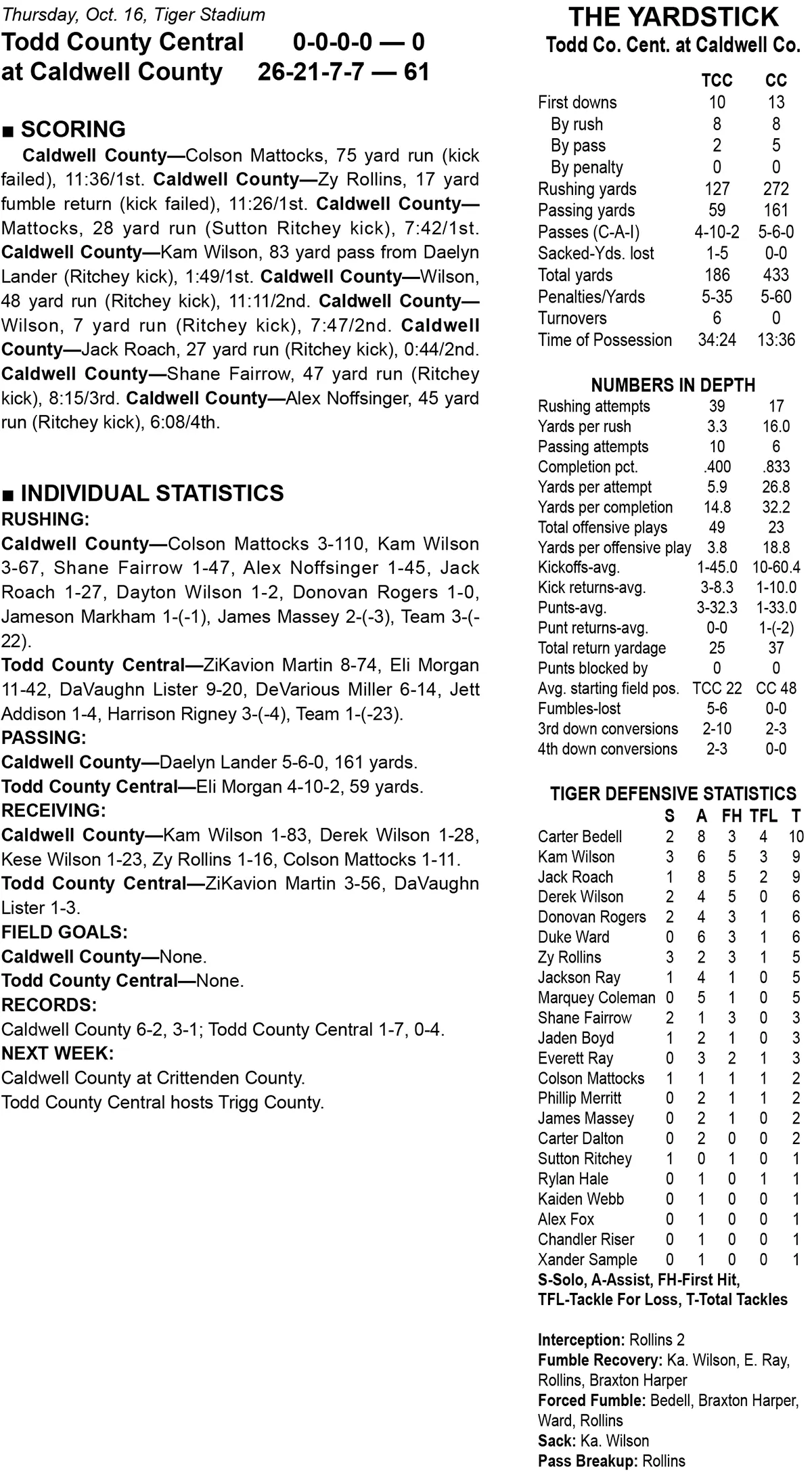 The Caldwell County Tigers improved to 6-2 Thursday night with a 61-0 win over Todd County Central.