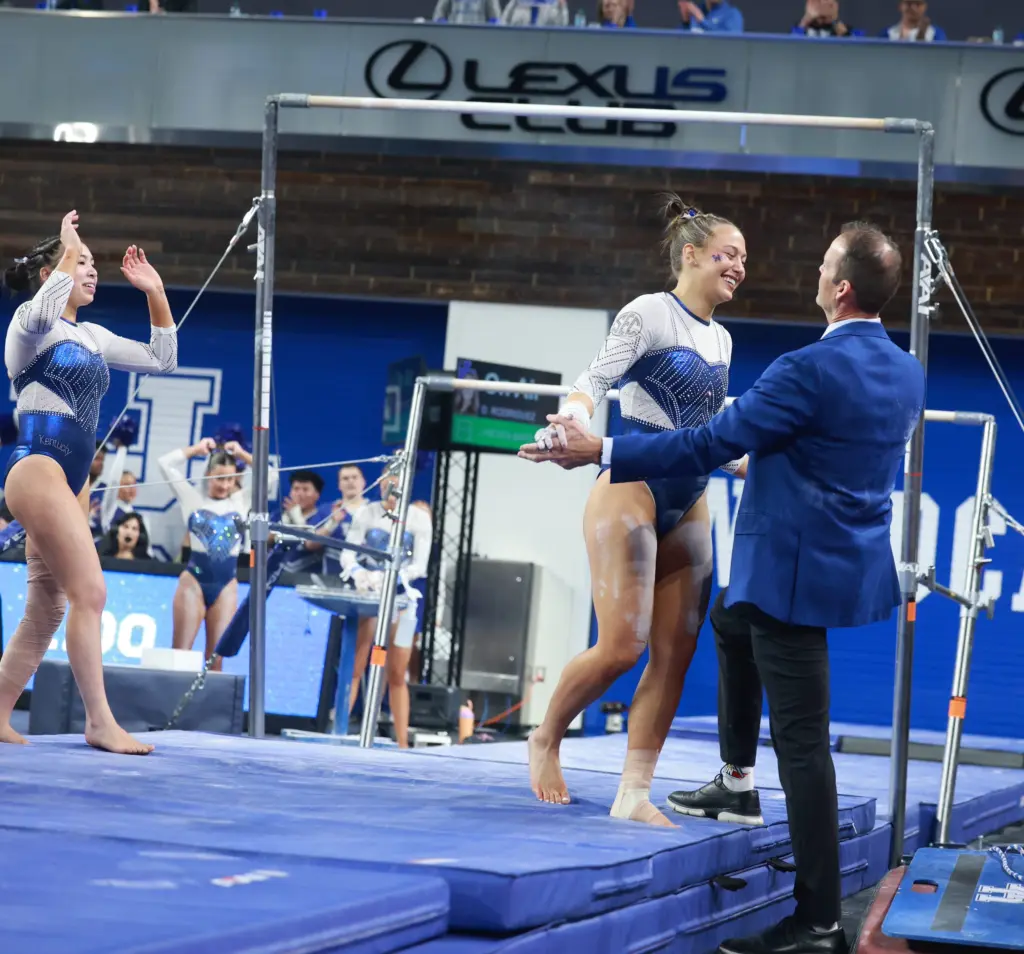 Kentucky coach Tim Garrison greeted junior Delaynee Rodriguez after her performance on uneven bars. (Vicky Graff Photo)
