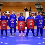 The seniors — Deacon Harrison, Brodie Smith, Dane Miller, Evan Graham, Cayden Hayden, and Treshawn Crenshaw, as well as Lady Colonel Kira Caldwell — were recognized ahead of a dual match with Russellville.