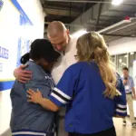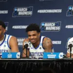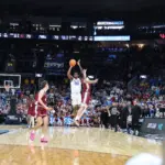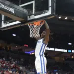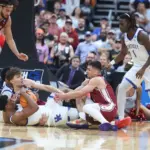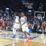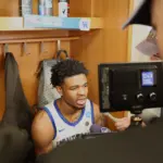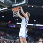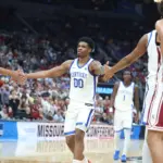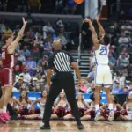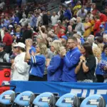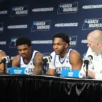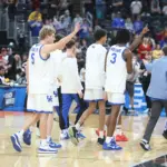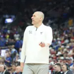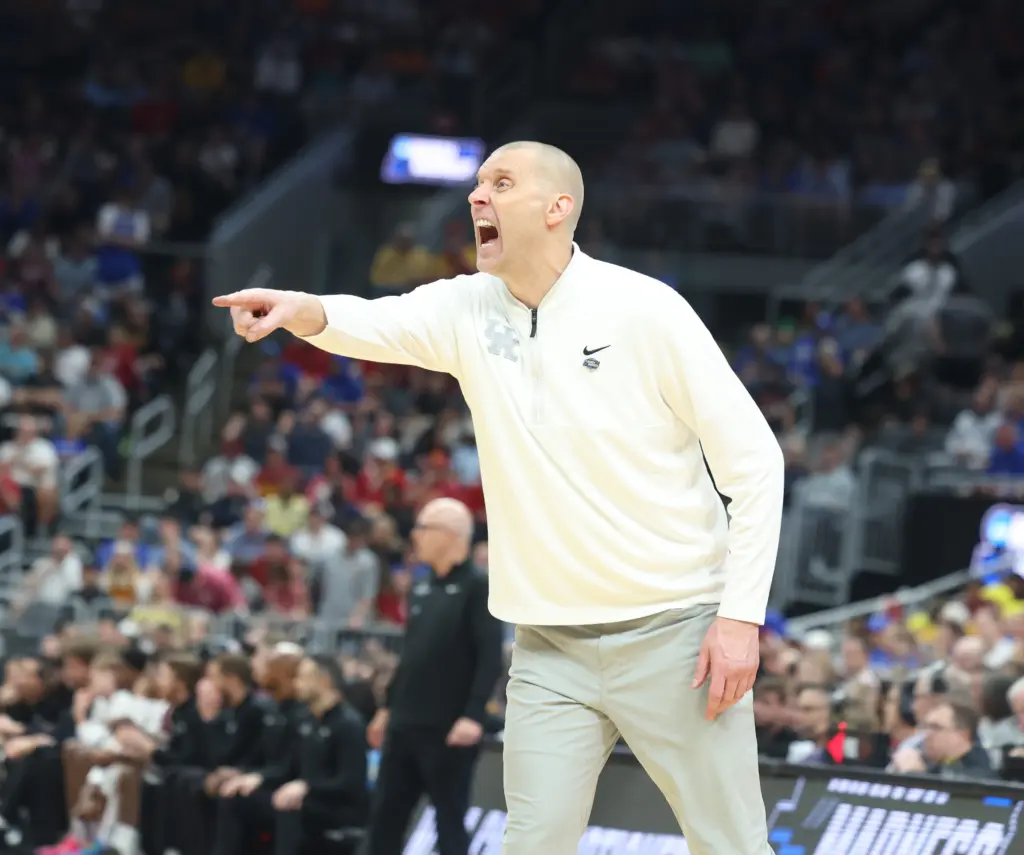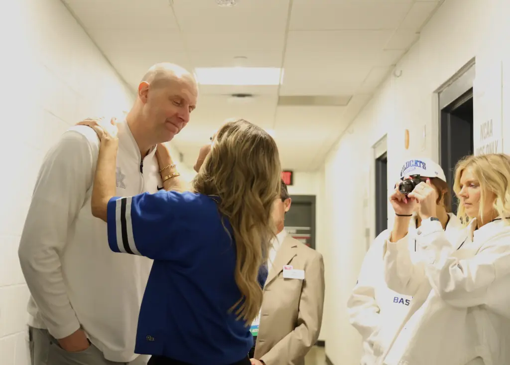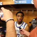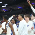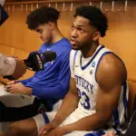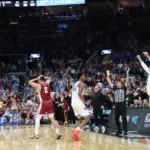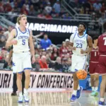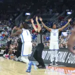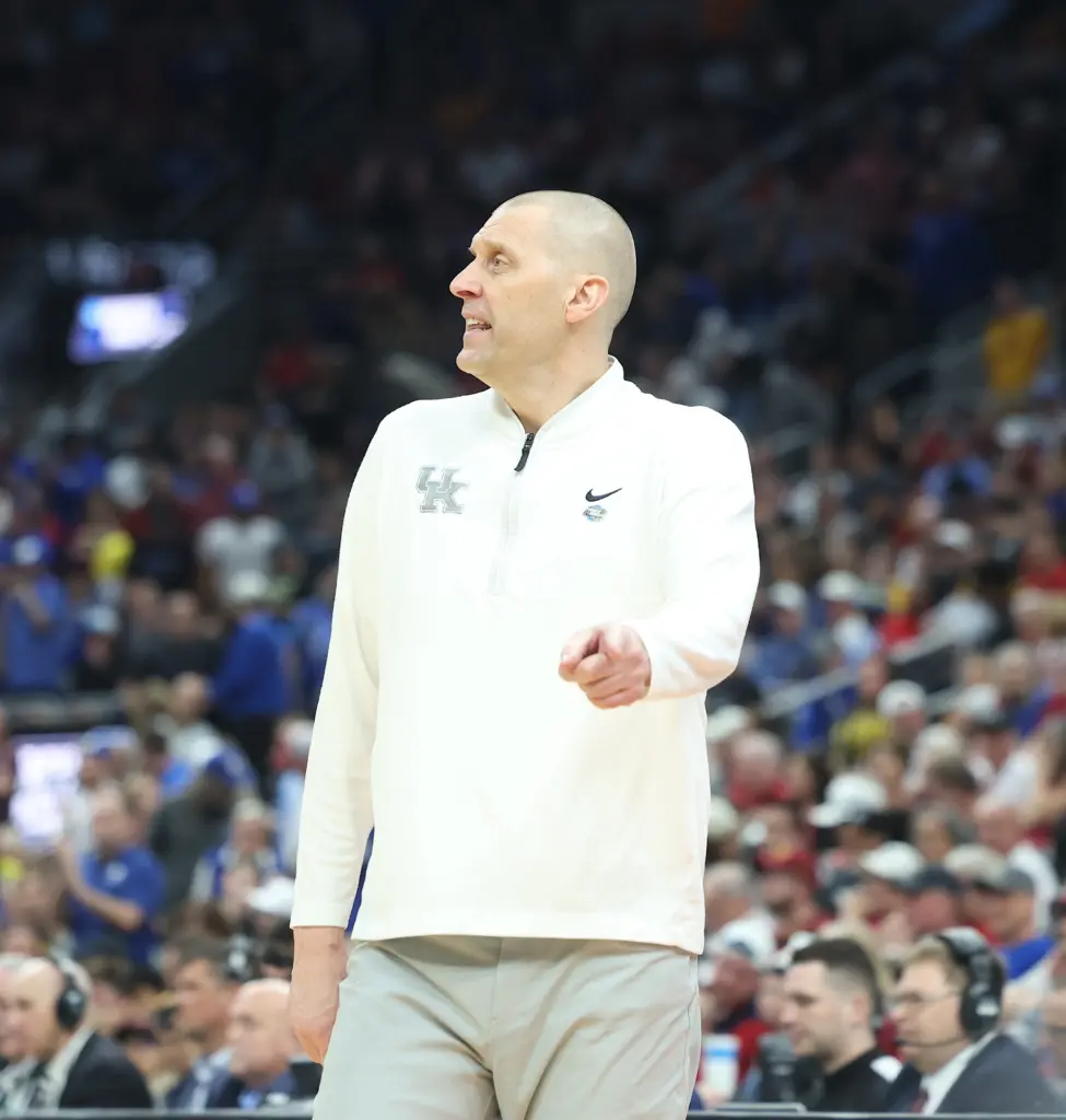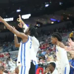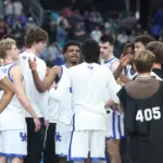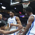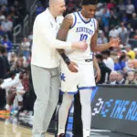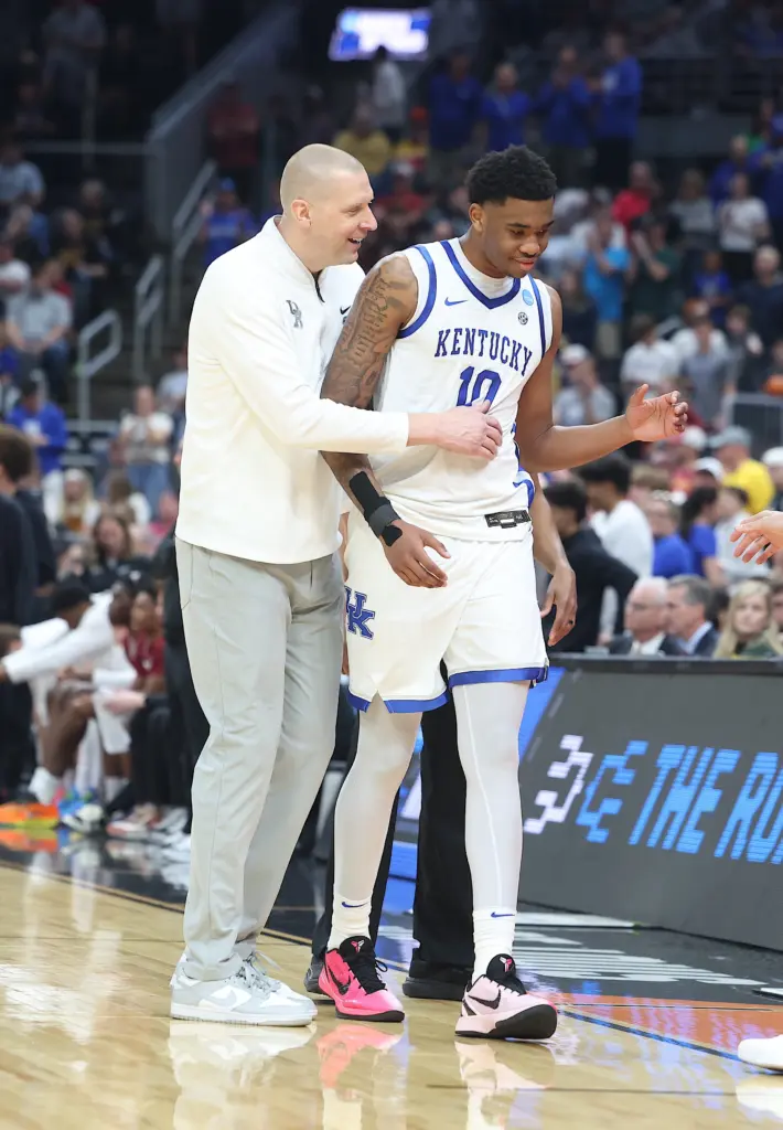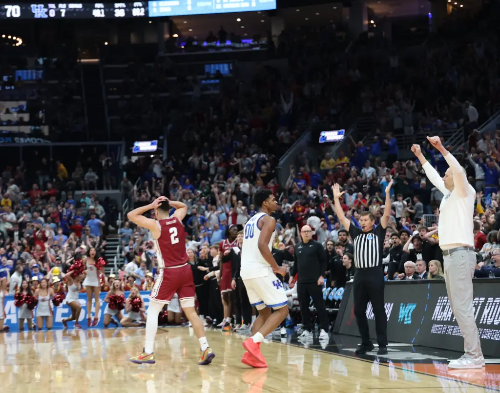 Kentucky coach Mark Pope and Santa Clara coach Herb Sendek watch Otega Oweh launch the shot that tied the game at the buzzer and gave UK a chance to win in overtime. (Vicky Graff Photo)