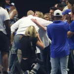 As he was introduced, Pope flashed his jersey and made his way down from section 224 to the court to a roaring applause.