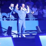 Mark Pope shows off his former No. 41 UK jersey from the top of Rupp Arena at Big Blue Madness. (Vicky Graff Photo)